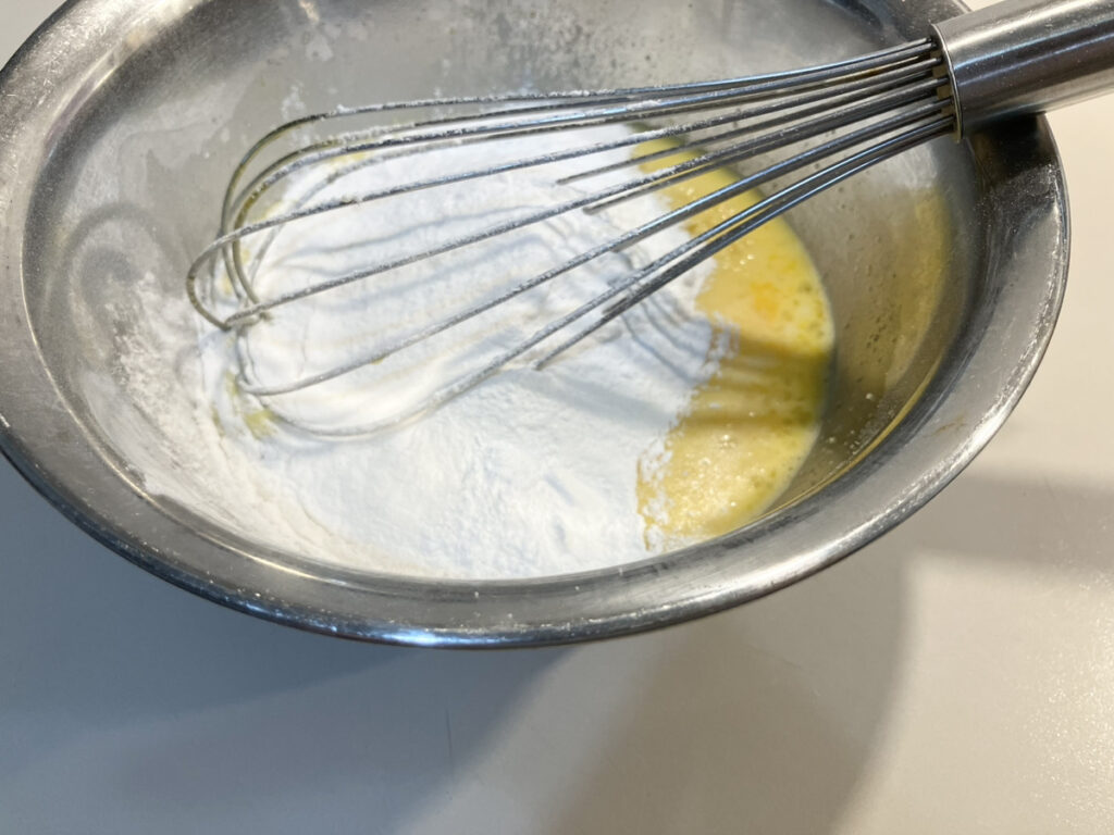 1.ボウルに卵と砂糖を入れて混ぜ、牛乳を加える。